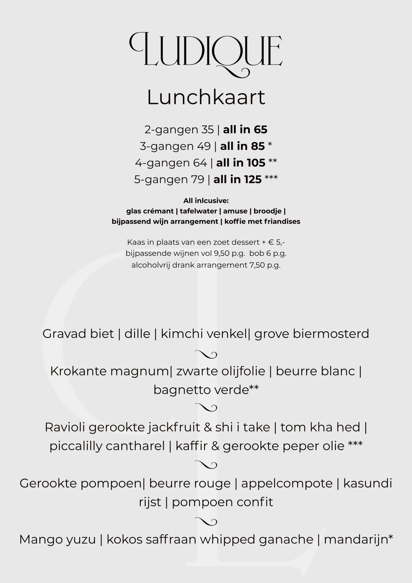 Een goede lunch in Delft verdient goede wijn. Bij Ludique serveren we een zorgvuldig samengesteld wijnarrangement dat perfect aansluit op de gerechten van het moment. U proeft bijzondere wijnen van kleine producenten. Vaak biologisch, altijd met karakter. Onze wijnen komen onder andere van Wijn van Steve en Wijnimport J. Bart. Liever een alcoholvrij arrangement? Ook daar hebben we verrassende opties voor.